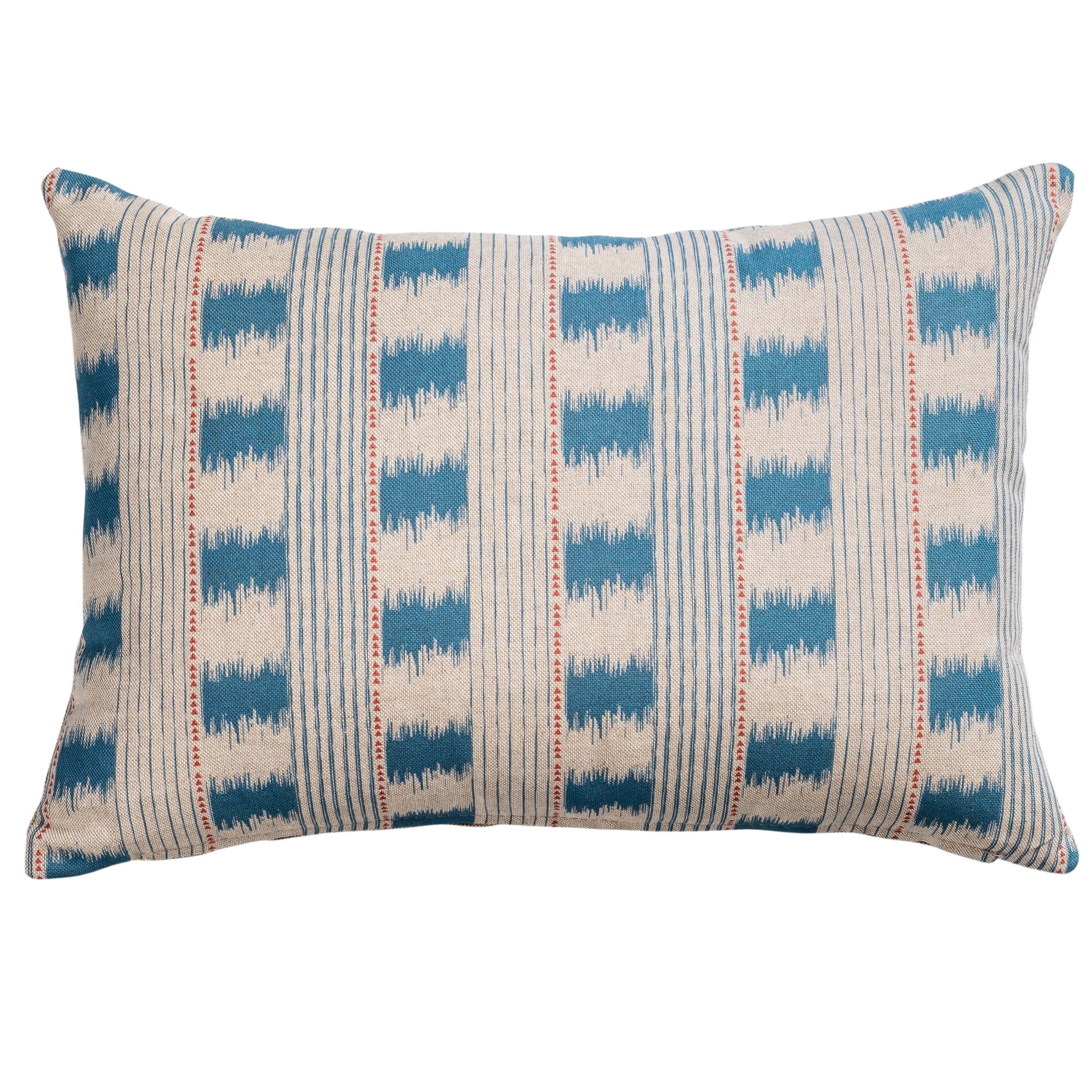 A textured nautical stripe cushion featuring rhythmic ikat-style blocks in rich denim blue, accented with fine coral detailing. Set against a natural linen-look background for a handcrafted, woven aesthetic that adds depth and interest. The perfect rustic design for adding a relaxed coastal feel to your contemporary interior.