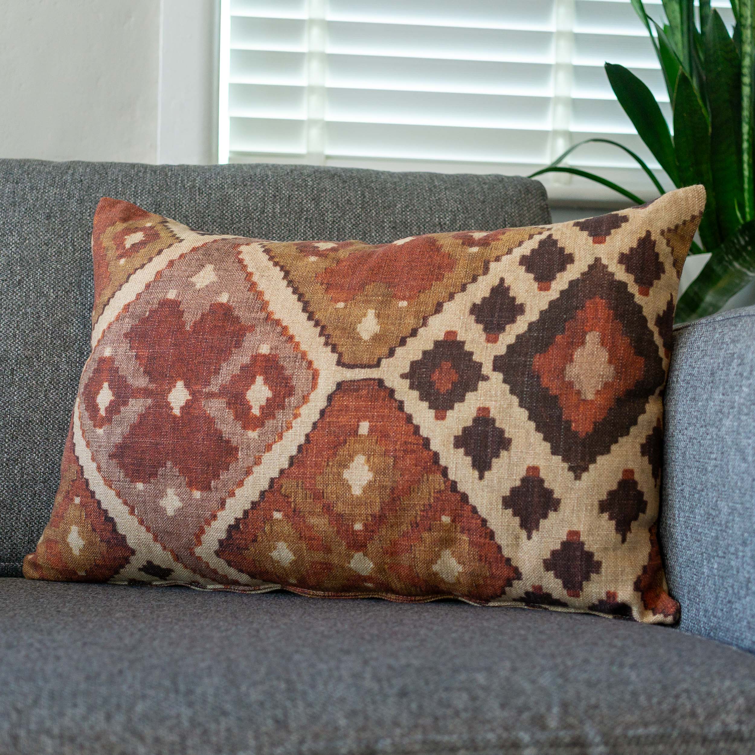 Printed on a sumptuous heavyweight linen cloth this printed Earthy terracotta kilim design feels and looks great. Its relaxed style and bold Persian inspired design are perfect for an inspired interior.
