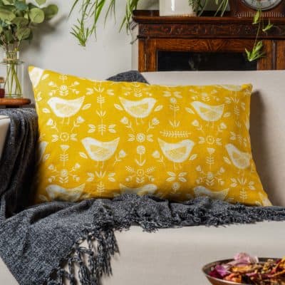 Contemporary Scandinavian inspired block-print style design with birds and illustrated flowers printed in on-trend shades of ochre yellow.