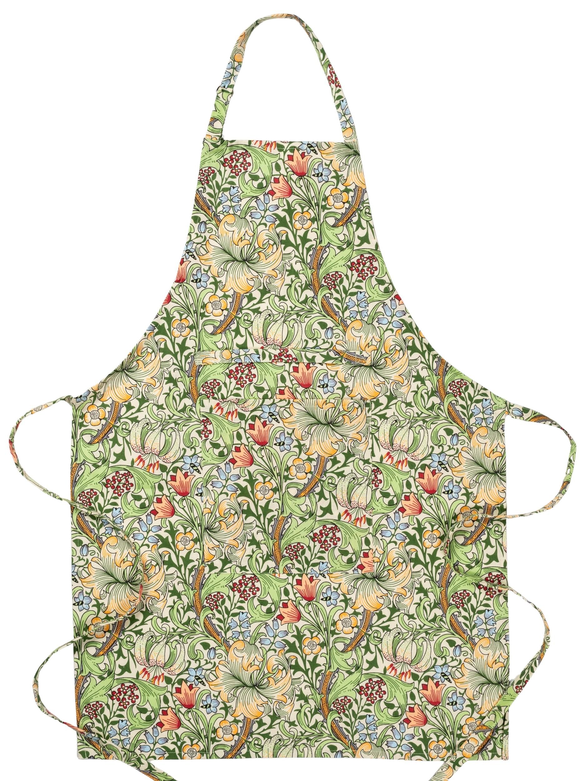 With entwining lily stems, tendrils and floral emblems, this genuine William Morris apron showcases the artist’s signature botanical vibe. Crafted from 100% cotton and easily washable, this apron seamlessly blends functionality with timeless nature-inspired charm. The perfect kitchen accessory for adding a touch of elegance.