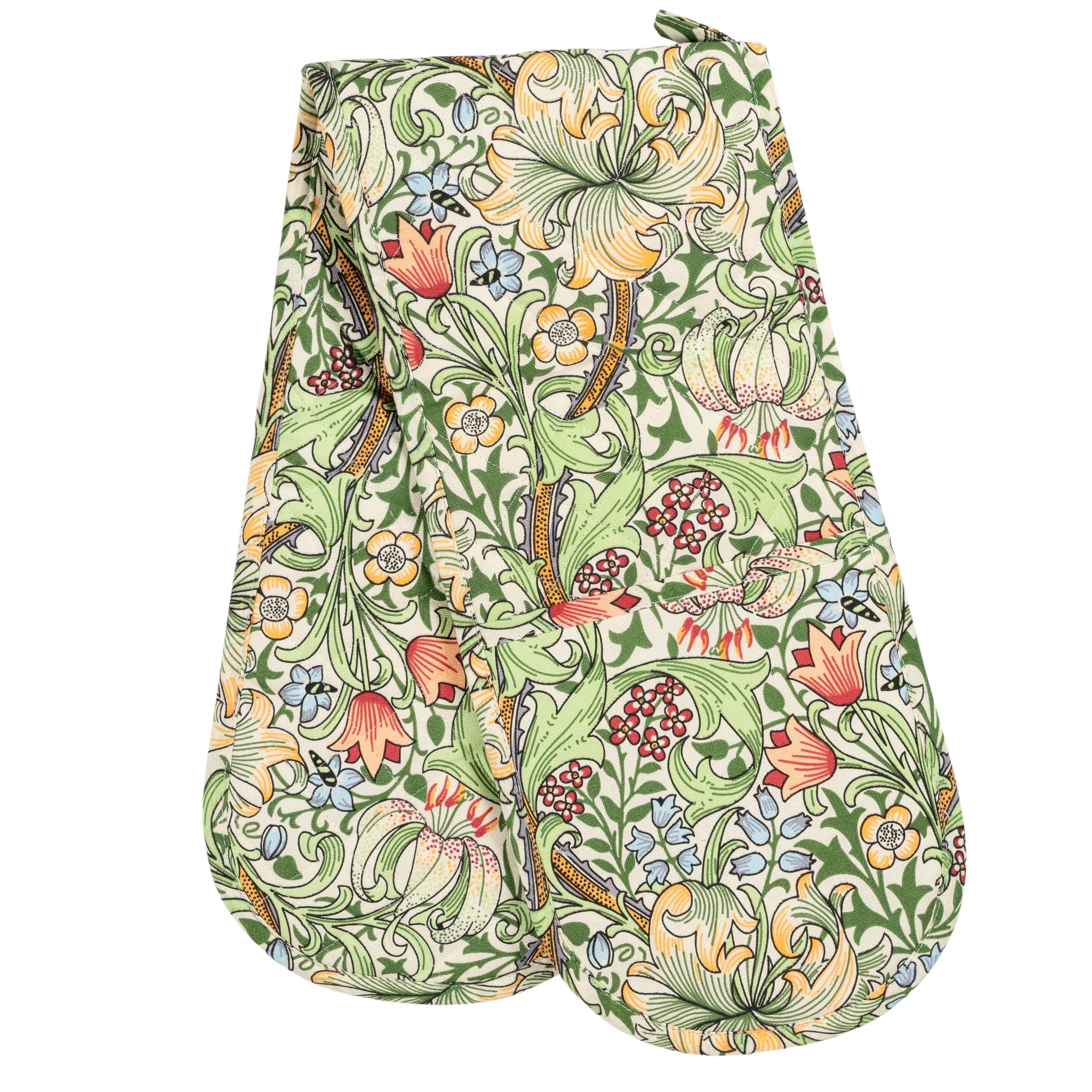 With weaving lily stems, tendrils and floral emblems, these genuine William Morris double oven gloves showcases the artist’s signature botanical vibe. Crafted from 100% cotton and easily washable, these oven mitts seamlessly blend functionality with timeless nature-inspired beauty. The perfect kitchen accessory for adding a touch of elegance.
