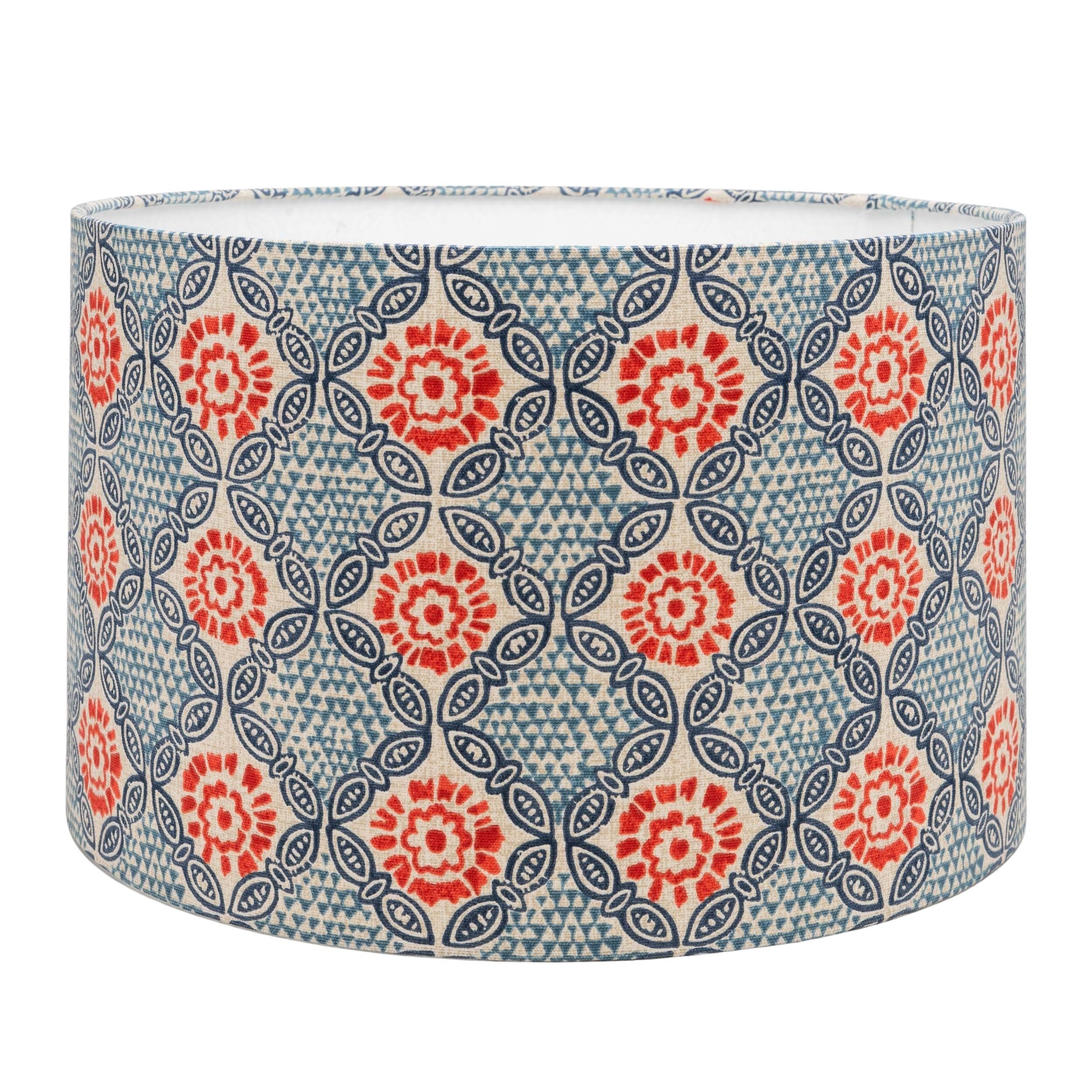 Crafted on a crisp 100% BCI-approved cotton cloth, a delicate repeating geometric batik inspired design is printed in a burnt orange and indigo blue. Featuring floral emblems and interconnecting botanical inspired motifs, this Mediterranean-inspired lampshade is reminiscent of the beautiful tilework of Morocco.